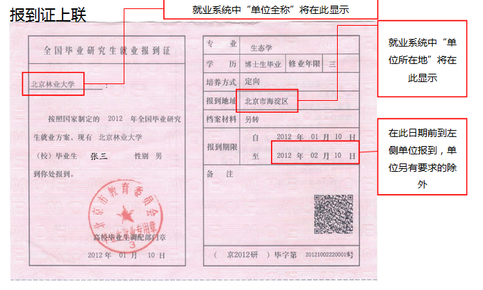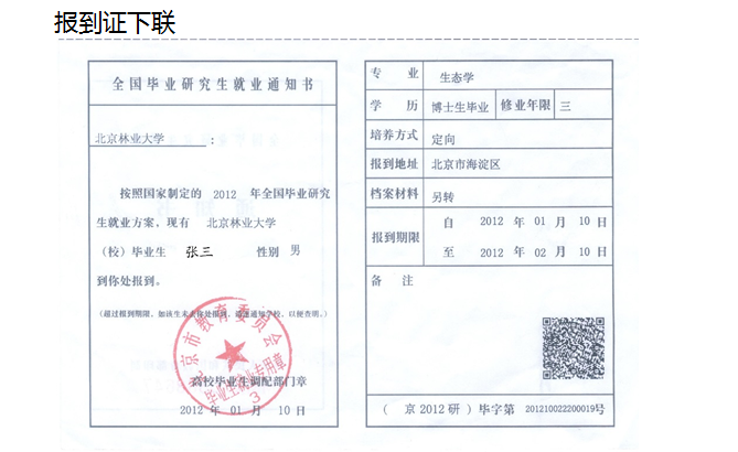毕业生在学校就业系统进行毕业信息填报后,学校将依据填报内容,向上级主管部门报送就业方案,就业方案审批通过后,由上级主管部门核发报到证。继续升学(包括博士后)的毕业生没有报到证;申请暂缓派遣的毕业生需要在向学校申请派遣后,方能办理报到证。其余毕业生均需在办理离校手续时领取报到证,并在有效期内到单位报到。就业通知书则放入毕业生档案内封存,并随档案转寄。