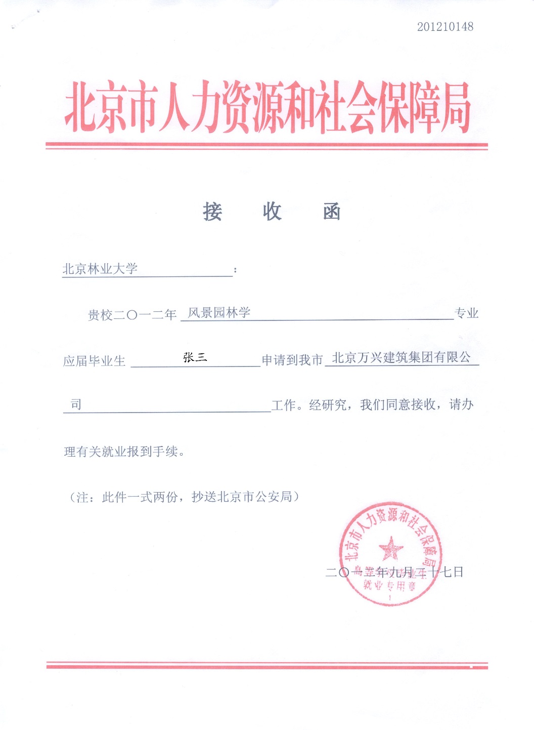 按照北京市的规定,外地生源派北京必须先拿到人力资源和社会保障部或者北京市人力资源和社会保障局开具的接收函(见下图)。接收函需与三方协议书第一联同时上交学校。