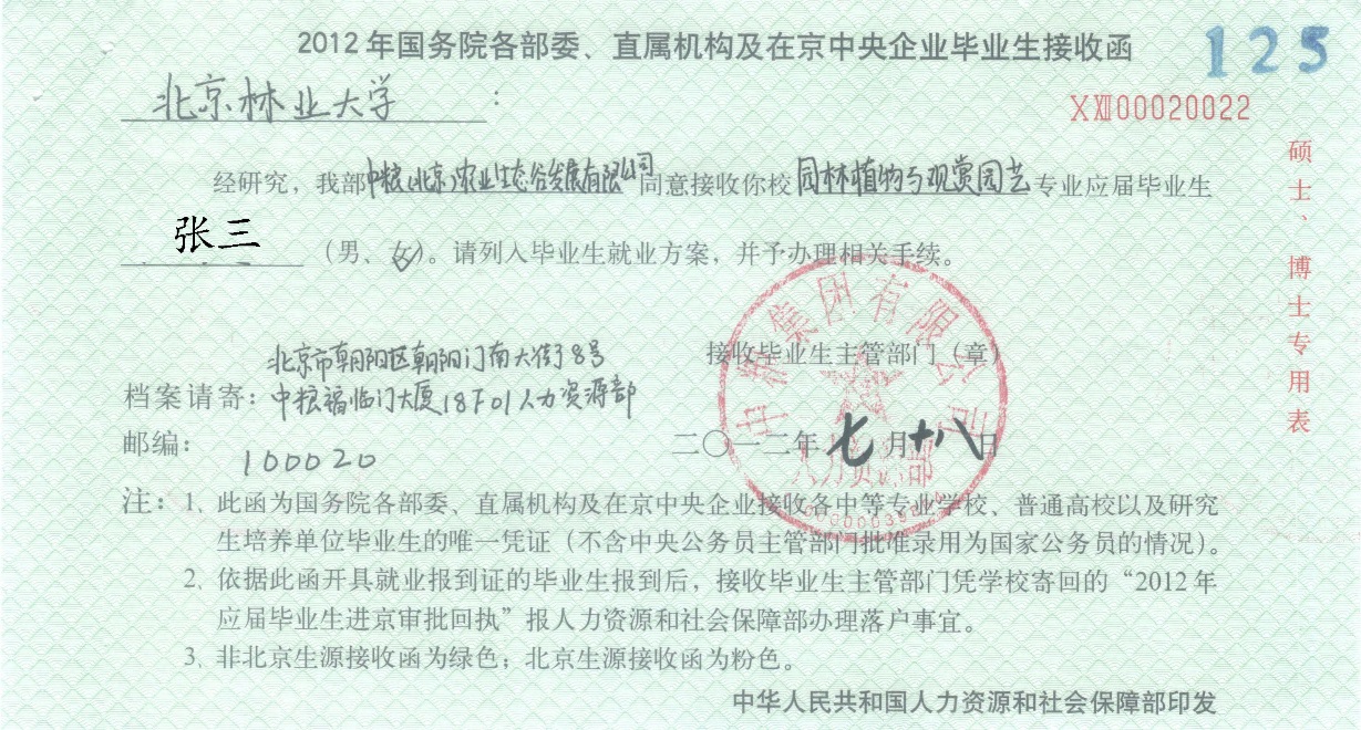 按照北京市的规定,外地生源派北京必须先拿到人力资源和社会保障部或者北京市人力资源和社会保障局开具的接收函(见下图)。接收函需与三方协议书第一联同时上交学校。