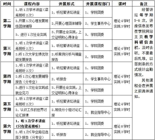 学术讲堂与英才训练是经济管理类学生必修的一门拓展综合能力和提高学术水平的一门重要的、理论与实践相结合的课程。总学时1.5周(理论20学时,实践15学时),课程分为五个学期完成,从第二学期至第六学期。