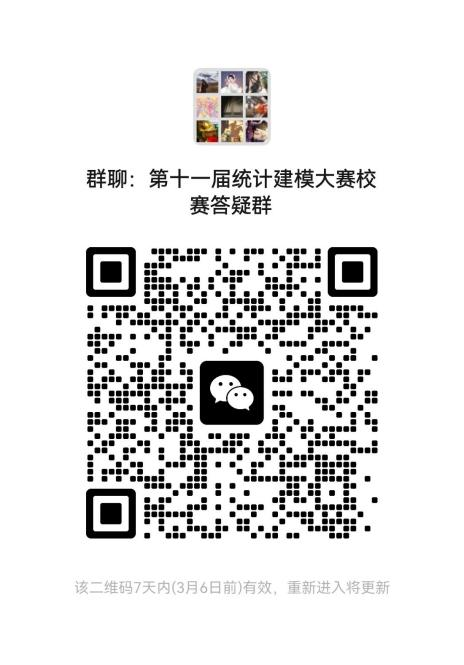 请两项报名步骤均完成的各队队长扫码加入第十一届全国大学生统计建模大赛校赛答疑群,后续通知将在本群发布。
