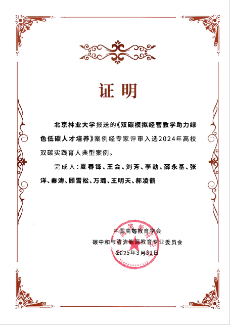 近日,中国高等教育学会碳中和与清洁能源教育专业委员会公布“2024年高校双碳实践育人案例”评选结果,北京林业大学经济管理学院高级实验师夏春锋等申报的“双碳模拟经营教学助力经管类绿色低碳人才培养”,获评2024年度高校双碳实践育人典型案例。这是我院在绿色人才培养领域取得的又一重要成果。