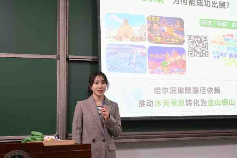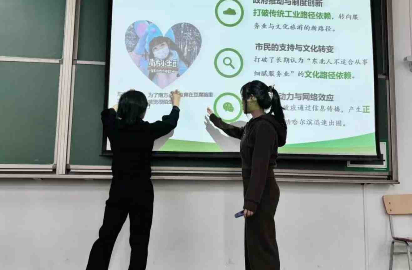 乔丹老师的参赛课程是《制度经济学》,在拆解路径依赖这一知识点的时候,她以哈尔滨旅游业爆火的网络热点,瞬间抓住学生眼球,充分调动起学生们的兴趣,在一个个问题中不断引导学生,进而引发课堂上对于如何破除路径依赖,实现东北振兴的思辨讨论,她将复杂知识拆解为循序渐进的“知识阶梯”,将复杂的知识结构做成思维导图,用大量生动实例辅助课堂。